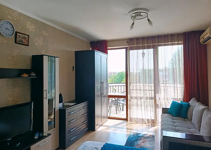Гості можуть користуватися обладнаною кухнею з електрочайником, холодильником і духовкою для самостійного приготування їжі. Гості також можуть сісти на автобус на автовокзалі Policlinic, розташованому за 5 хвилини пішки, щоб оглянути решту Сонячного Берега. Завдяки таким розкошам, як патіо і супутниковому плоскому екрану в помешканні, ви отримаєте максимум задоволення від відпочинку.